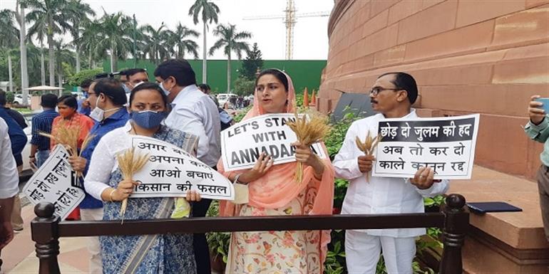 ਚੰਡੀਗੜ੍ਹ : ਇਕ ਵਿਲੱਖਣ ਪ੍ਰਦਰਸ਼ਨ ‘ਚ ਅਕਾਲੀ ਦਲ ਤੇ ਬਹੁਜਨ ਸਮਾਜ ਪਾਰਟੀ (ਬਸਪਾ) ਦੇ ਸੰਸਦ ਮੈਂਬਰਾਂ ਨੇ ਅੱਜ ਸੰਸਦ ਮੈਂਬਰਾਂ ਨੁੰ ਕਣਕ ਦੀਆਂ ਬੱਲੀਆਂ ਦੇ ਕੇ ਦਿੱਲੀ ਦੇ ਬਾਰਡਰਾਂ ’ਤੇ ਸ਼ਾਂਤੀਪੂਰਨ ਢੰਗ ਨਾਲ ਰੋਸ ਪ੍ਰਦਰਸ਼ਨ ਵਿਚ ਡਟੇ ਹਜ਼ਾਰਾਂ ਕਿਸਾਨਾਂ ਦੀ ਦਸ਼ਾ ਉਜਾਗਰ ਕੀਤੀ ਤੇ ਉਹਨਾਂ ਲਈ ਨਿਆਂ ਮੰਗਿਆ। ਸਾਬਕਾ ਕੇਂਦਰੀ ਮੰਤਰੀ ਹਰਸਿਮਰਤ ਕੌਰ ਬਾਦਲ, ਜੋ ਪ੍ਰਦਰਸਸ਼ਨ ਦੀ ਅਗਵਾਈ ਕਰ ਰਹੇ ਸਨ, ਨੇ ਐਨ ਡੀ ਏ ਦੇ ਮੰਤਰੀਆਂ ਤੇ ਸੰਸਦ ਮੈਂਬਰਾਂ ਨੁੰ ਇਹ ਕਣਕ ਦੀਆਂ ਬੱਲੀਆਂ ਭੇਂਟ ਕੀਤੀਆਂ ਤੇ ਉਹਨਾਂ ਨੁੰ ਕੇਂਦਰ ਸਰਕਾਰ ਵੱਲੋਂ ਕਿਸਾਨਾਂ ਨਾਲ ਕੀਤੇ ਜਾ ਰਹੇ ਵਿਆਰ ’ਤੇ ਆਤਮ ਚਿੰਤਨ ਕਰਨ ਵਾਸਤੇ ਆਖਿਆ। ਜਿਥੇ ਮੰਤਰੀਆਂ ਨੇ ਕਣਕ ਦੀਆਂ ਬੱਲੀਆਂ ਸਵੀਕਾਰ ਨਹੀਂ ਕੀਤੀਆਂ, ਉਥੇ ਹੀ ਬਹੁਤ ਸਾਰੇ ਸੰਸਦ ਮੈੀਬਰਾਂ ਨੇ ਨਾ ਸਿਰਫ ਇਹ ਪ੍ਰਵਾਨ ਕੀਤੀਆਂ ਬਲਮਿ ਰਮਾ ਦੇਵੀ ਨੇ ਇਹ ਬੱਲੀਆਂ ਮੱਥੇ ’ਤੇ ਲਾ ਕੇ ਇਹਨਾਂ ਪ੍ਰਤੀ ਸਤਿਕਾਰ ਦਰਸਾਇਆ। ਪੱਤਰਕਾਰਾਂ ਨਾਲ ਗੱਲਬਾਤ ਕਰਦਿਆਂ ਬਾਦਲ ਨੇ ਕਿਹਾ ਕਿ ਜੇਕਰ ਅਸੀਂ ਰੋਜ਼ ਭੋਜਨ ਛੱਕ ਰਹੇ ਹਾਂ ਤਾਂ ਇਸ ਲਈ ਕਿਸਾਨਾਂ ਨੂੰ ਧੰਨਵਾਦ ਕਰਨਾ ਬਣਦਾ ਹੈ। ਉਹਨਾਂ ਕਿਹਾ ਕਿ ਹੈਰਾਨੀਵ ਾਲੀ ਗੱਲ ਹੈ ਕਿ ਇਕ ਭਾਈਚਾਰਾ ਜੋ ਸਭ ਲੀ ਕੰਮ ਕਰਦਾ ਹੈ, ਨਾਲ ਕੇਂਦਰ ਸਰਕਾਰ ਬਦਸਲੂਕੀ ਕਰ ਰਹੀ ਹੈ ਤੇ ਤਿੰਨ ਕਾਲੇ ਖੇਤੀ ਕਾਨੁੰਨ ਰੱਦ ਕਰਨ ਤੋਂ ਇਨਕਾਰੀ ਹੈ। ਉਹਨਾਂ ਕਿਹਾ ਕਿ ਅਸੀਂ ਅੱਜ ਸੰਸਦ ਮੈਂਬਰਾਂ ਨੁੰ ਕਣਕ ਦੀਆਂ ਬੱਲੀਆਂ ਭੇਂਟ ਕਰ ਕੇ ਉਹਨਾਂ ਨੁੰ ਆਪਣੇ ਨੀਤੀ ਘਾੜਿਆਂ ਦੀ ਆਪਣੀ ਜ਼ਮੀਰ ਉਹਨਾਂ ਪ੍ਰਤੀ ਜਗਾਉਣ ਦੀ ਅਪੀਲ ਕੀਤੀ ਹੈ ਜੋ ਸਾਨੂੰ ਭੋਜਨ ਦੇ ਰਹੇ ਹਨ।
