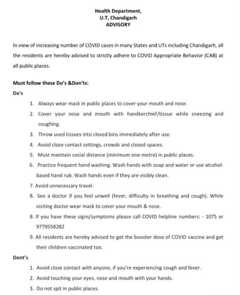 ਚੰਡੀਗੜ੍ਹ : ਦੇਸ਼ ਭਰ ਵਿੱਚ ਵਧ ਰਹੇ ਕੋਰੋਨਾ ਕੇਸਾਂ ਨੂੰ ਵੇਖਦਿਆਂ ਚੰਡੀਗੜ੍ਹ ਪ੍ਰਸ਼ਾਸਨ ਸਖਤ ਹੋ ਗਿਆ ਹੈ। ਕੋਰੋਨਾ ਦੇ ਵੱਧਦੇ ਮਾਮਲਿਆਂ ਦੇ ਮੱਦੇਨਜ਼ਰ ਯੂਟੀ ਪ੍ਰਸ਼ਾਸਨ ਨੇ ਇੱਕ ਵਾਰ ਫਿਰ ਮਾਸਕ ਪਹਿਨਣ ਤੇ ਕੋਵਿਡ ਨਿਯਮਾਂ ਦੀ ਪਾਲਣਾ ਨੂੰ ਸਖ਼ਤੀ ਨਾਲ ਲਾਗੂ ਕਰਨ ਦੀ ਐਡਵਾਈਜ਼ਰੀ ਜਾਰੀ ਕੀਤੀ ਹੈ।