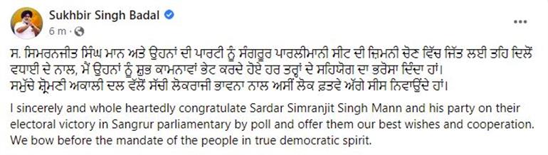 Sangrur By election Result 2022: ਸ਼੍ਰੋਮਣੀ ਅਕਾਲੀ ਦਲ ਬਾਦਲ ਦੇ ਪ੍ਰਧਾਨ ਸੁਖਬੀਰ ਬਾਦਲ ਨੇ ਲੋਕ ਸਭਾ ਚੋਣਾਂ ਵਿੱਚ ਜਿੱਤ ਲਈ ਸਿਮਰਨਜੀਤ ਸਿੰਘ ਮਾਨ ਨੂੰ ਵਧਾਈ ਦਿੱਤੀ ਹੈ। ਸੁਖਬੀਰ ਬਾਦਲ ਨੇ ਸੋਸ਼ਲ ਮੀਡੀਆ ਉੱਪਰ ਪੋਸਟ ਸ਼ੇਅਰ ਕਰਦਿਆਂ ਕਿਹਾ ਹੈ ਕਿ ਸਿਮਰਨਜੀਤ ਸਿੰਘ ਮਾਨ ਤੇ ਉਨ੍ਹਾਂ ਦੀ ਪਾਰਟੀ ਨੂੰ ਸੰਗਰੂਰ ਪਾਰਲੀਮਾਨੀ ਸੀਟ ਦੀ ਜ਼ਿਮਨੀ ਚੋਣ ਵਿੱਚ ਜਿੱਤ ਲਈ ਤਹਿ ਦਿਲੋਂ ਵਧਾਈ ਦੇ ਨਾਲ, ਮੈਂ ਉਨ੍ਹਾਂ ਨੂੰ ਸ਼ੁਭ ਕਾਮਨਾਵਾਂ ਭੇਟ ਕਰਦੇ ਹੋਏ ਹਰ ਤਰ੍ਹਾਂ ਦੇ ਸਹਿਯੋਗ ਦਾ ਭਰੋਸਾ ਦਿੰਦਾ ਹਾਂ। ਸਮੁੱਚੇ ਸ਼੍ਰੋਮਣੀ ਅਕਾਲੀ ਦਲ ਵੱਲੋਂ ਸੱਚੀ ਲੋਕਰਾਜੀ ਭਾਵਨਾ ਨਾਲ ਅਸੀਂ ਲੋਕ ਫ਼ਤਵੇ ਅੱਗੇ ਸੀਸ ਨਿਵਾਉਂਦੇ ਹਾਂ।