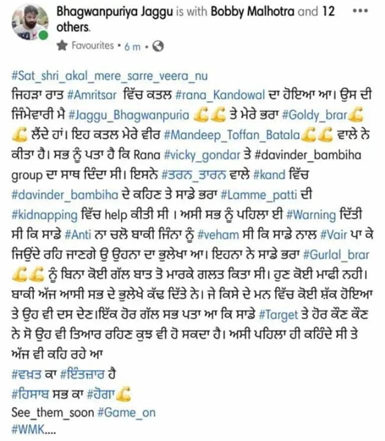 ਅੰਮ੍ਰਿਤਸਰ : ਗੈਂਗਸਟਰ ਰਣਬੀਰ ਸਿੰਘ ਰਾਣਾ ਕੰਦੋਵਾਲੀਆ ਦੇ ਕਤਲ ਦੀ ਜ਼ਿੰਮੇਵਾਰੀ ਖ਼ਤਰਨਾਕ ਗੈਂਗਸਟਰ ਜੱਗੂ ਭਗਵਾਨਪੁਰੀਆ ਨੇ ਫੇਸਬੁੱਕ ਆਈ. ਡੀ. 'ਤੇ ਲੈ ਲਈ ਗਈ। ਇਥੇ ਦੱਸਣਯੋਗ ਹੈ ਕਿ ਗੈਂਗਸਟਰ ਰਣਬੀਰ ਸਿੰਘ ਰਾਣਾ ਕੰਦੋਵਾਲੀਆ ਦਾ 4 ਹਥਿਆਰਬੰਦ ਹਮਲਾਵਰਾਂ ਨੇ ਕਤਲ ਕਰ ਦਿੱਤਾ ਸੀ। ਇਸ ਵਾਰਦਾਤ ਵਿਚ ਰਾਣਾ ਕੰਦੋਵਾਲੀਆ ਦਾ ਇਕ ਹੋਰ ਸਾਥੀ ਤੇਜਬੀਰ ਸਿੰਘ ਵੀ ਜ਼ਖਮੀ ਹੋ ਗਿਆ ਸੀ। ਹਮਲੇ ਦੌਰਾਨ ਇਕ ਸਕਿਓਰਿਟੀ ਗਾਰਡ ਵੀ ਜ਼ਖ਼ਮੀ ਹੋਇਆ ਸੀ।ਜੱਗੂ ਭਗਵਾਨਪੁਰੀਆ ਨੇ ਫੇਸਬੁੱਕ ਆਈ. ਡੀ. 'ਤੇ ਇਸ ਕਤਲ ਦੀ ਜ਼ਿੰਮੇਵਾਰੀ ਲੈਂਦਿਆਂ ਲਿਖਿਆ ਕਿ ਜਿਹੜਾ ਰਾਤ ਅੰਮ੍ਰਿਤਸਰ ਵਿਚ ਰਾਣਾ ਕੰਧੋਵਾਲੀਆ ਦਾ ਕਤਲ ਹੋਇਆ ਸੀ, ਉਸ ਦੀ ਜ਼ਿੰਮੇਵਾਰੀ ਮੈਂ ਜੱਗੂ ਭਗਵਾਨਪੁਰੀਆ ਤੇ ਮੇਰਾ ਭਰਾ ਗੋਲਡੀ ਬਰਾੜ ਲੈਂਦੇ ਹਾਂ। ਇਹ ਕਤਲ ਮੇਰੇ ਵੀਰ ਮਨਦੀਪ ਤੂਫਾਨ ਬਟਾਲਾ ਵਾਲੇ ਨੇ ਕੀਤਾ ਹੈ। ਸਭ ਨੂੰ ਪਤਾ ਹੈ ਕਿ ਰਾਣਾ ਵਿਕੀ ਗੌਂਡਰ ਤੇ ਦਵਿੰਦਰ ਬੰਬੀਹਾ ਗਰੁੱਪ ਦਾ ਸਾਥ ਦਿੰਦਾ ਸੀ। ਇਸ ਨੇ ਤਰਨਤਾਰਨ ਵਾਲੇ ਕਾਂਡ ਵਿਚ ਦਵਿੰਦਰ ਬੰਬੀਹਾ ਦੇ ਕਹਿਣ 'ਤੇ ਸਾਡੇ ਭਰਾ ਲੰਮਾ ਪੱਟੀ ਦੀ ਕਿਡਨੈਪਿੰਗ ਵਿਚ ਮਦਦ ਕੀਤੀ ਸੀ।