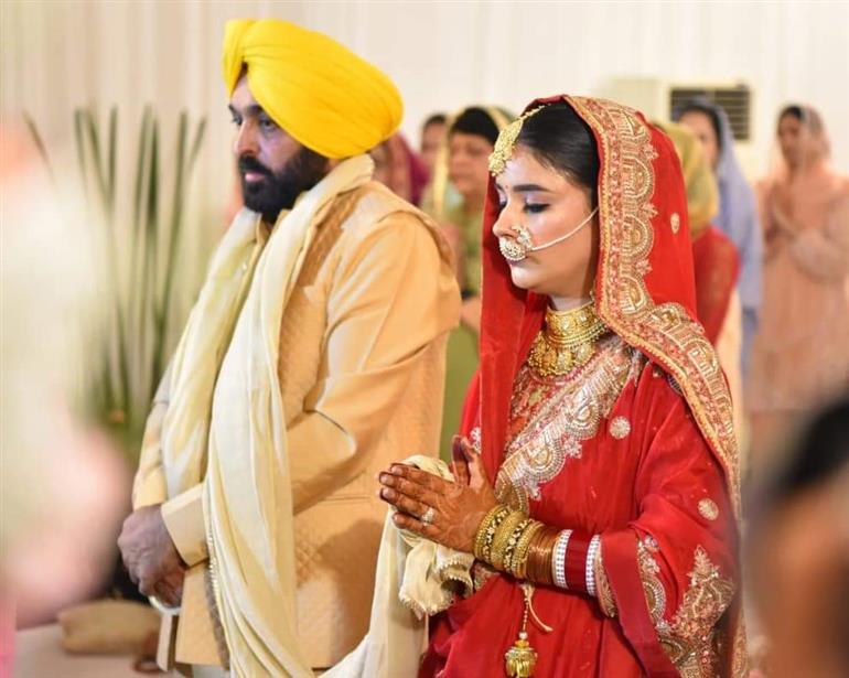 Bhagwant Mann Marriage: ਮੁੱਖ ਮੰਤਰੀ ਭਗਵੰਤ ਸਿੰਘ ਮਾਨ ਦੇ ਡਾ. ਗੁਰਪ੍ਰੀਤ ਕੌਰ ਦੇ ਮੁੱਖ ਮੰਤਰੀ ਦੀ ਸਰਕਾਰੀ ਰਿਹਾਇਸ਼ ’ਤੇ ਆਨੰਦ ਕਾਰਜ ਹੋਏ। ਇਸ ਦੇ ਨਾਲ ਹੀ ਡਾ. ਗੁਰਪ੍ਰੀਤ ਕੌਰ ਭਗਵੰਤ ਦੇ ਪਤਨੀ ਬਣ ਗਏ ਹਨ। ਦਿਲਚਸਪ ਗੱਲ ਇਹ ਹੈ ਕਿ ਵਿਆਹ ਮੌਕੇ ਦਿੱਲੀ ਦੇ ਮੁੱਖ ਮੰਤਰੀ ਅਰਵਿੰਦ ਕੇਜਰੀਵਾਲ ਵੱਲੋਂ ਮੁੱਖ ਮੰਤਰੀ ਮਾਨ ਦੇ ਪਿਤਾ ਦੀਆਂ ਰਸਮਾਂ ਨਿਭਾਈਆਂ ਗਈਆਂ, ਜਦਕਿ ਮੁੱਖ ਮੰਤਰੀ ਦਾ ਭਾਣਜਾ ਉਨ੍ਹਾਂ ਦਾ ਸਰਬਾਲਾ ਬਣਿਆ। ਇਸ ਦੌਰਾਨ ਰਾਘਵ ਚੱਢਾ ਨੇ ਵਿਆਹ ਤੋਂ ਪਹਿਲਾਂ ਮੁੱਖ ਮੰਤਰੀ ਭਗਵੰਤ ਸਿੰਘ ਮਾਨ ਨਾਲ ਤਸਵੀਰ ਸਾਂਝੀ ਕੀਤੀ। ਮੁੱਖ ਮੰਤਰੀ ਪੀਲੇ ਰੰਗ ਦੀ ਪੁਸ਼ਾਕ ਅਤੇ ਪੀਲੀ ਦਸਤਾਰ ਸਜਾ ਵਿਆਹ ਲਈ ਤਿਆਰ ਹੋਏ। ਉਨ੍ਹਾਂ ਦੀ ਲਾੜੀ ਵੀ ਲਾਲ ਰੰਗੇ ਦੇ ਜੋੜੇ 'ਚ ਬੇਹੱਦ ਖੂਬਸੂਰਤ ਲਗ ਰਹੀ ਸੀ।ਇਹ ਪਹਿਲਾ ਮੌਕਾ ਹੈ ਜਦੋਂ ਕਿਸੇ ਮੁੱਖ ਮੰਤਰੀ ਦਾ ਸੀਐਮ ਹਾਊਸ ਦੇ ਅੰਦਰ ਹੀ ਵਿਆਹ ਹੋਇਆ ਹੋਵੇ। ਪੰਜਾਬ ਦੇ ਕਈ ਦਿੱਗਜ਼ਾਂ ਨੇ ਇਸ ਮੌਕੇ ਭਗਵੰਤ ਮਾਨ ਨੂੰ ਵਧਾਈ ਦਿੱਤੀ।