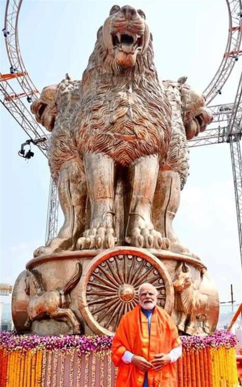 New Delhi: Prime Minister Narendra Modi on Monday unveiled the National Emblem cast on the roof of the new Parliament structure.The hallmark is made up of bronze with a total weight of,9500 kg and is 6.5 metre in height. It has been cast at the top of the central foyer of the new Parliament structure, and a supporting structure of steel weighing around,9500 kg has been constructed to support the hallmark, they said. Modi also interacted with workers involved in erecting the new Parliament.The conception sketch and process of casting of the national emblem on the roof of the new Parliament structure has gone through eight different stages of preparation from clay modelling and computer graphics to bronze casting and polishing, officers said.