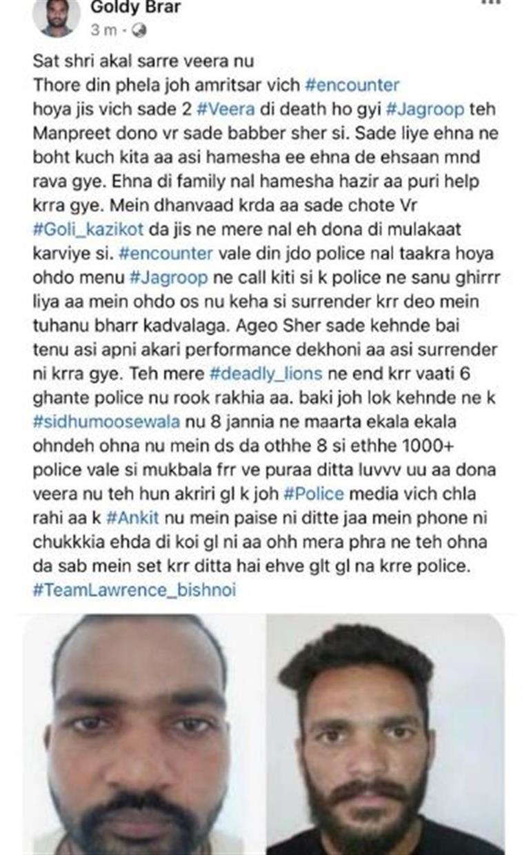 ਗੋਲਡੀ ਬਰਾੜ ਨੇ ਇਸ ਪੋਸਟ 'ਚ ਲਿਖਿਆ,"ਥੋੜੇ ਦਿਨ ਪਹਿਲਾਂ ਜੋ ਅੰਮ੍ਰਿਤਸਰ 'ਚ ਐਨਕਾਊਂਟਰ ਹੋਇਆ ਜਿਸ ਵਿੱਚ ਸਾਡੇ 2 ਵੀਰਾ ਦੀ ਮੌਤ ਹੋ ਗਈ ਜਗਰੂਪ ਤੇ ਮਨਪ੍ਰੀਤ ਦੋਨੋਂ ਸਾਡੇ ਬੱਬਰ ਸ਼ੇਰ ਸੀ।ਸਾਡੇ ਲਈ ਇਹਨਾਂ ਨੇ ਬਹੁਤ ਕੁੱਛ ਕੀਤਾ ਆ ਅਸੀਂ ਹਮੇਸ਼ਾ ਇਨ੍ਹਾਂ ਦੇ ਅਹਿਸਾਨਮੰਦ ਰਹਾਂਗੇ।ਇਨ੍ਹਾਂ ਦੇ ਪਰਿਵਾਰ ਨਾਲ ਹਮੇਸ਼ਾਂ ਹਾਜ਼ਿਰ ਰਹਾਂਗੇ ਪੂਰੀ ਮਦਦ ਕਰਦੇ ਰਹਾਂਗੇ।ਮੈਂ ਧੰਨਵਾਦ ਕਰਦਾਂ ਹਾਂ ਸਾਡੇ ਛੋਟੇ ਵੀਰ ਗੋਲੀ ਕਾਜ਼ੀਕੋਟ ਦਾ ਜਿਸ ਨੇ ਮੇਰੇ ਨਾਲ ਇਹ ਦੋਨਾਂ ਦੀ ਮੁਲਾਕਾਤ ਕਰਵਾਈ ਸੀ।