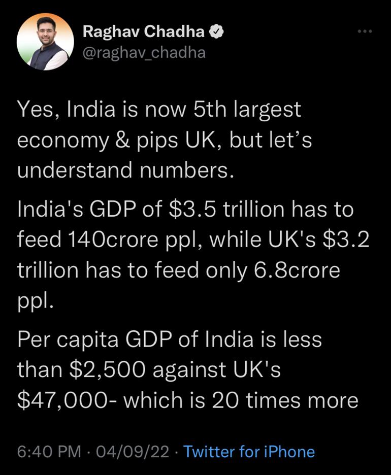 Rajya Sabha member from AAP Raghav Chadha has taken another angle of India becoming 5 largest economy. India is now 5th largest economy & pips UK, but let’s understand numbers. As per his tweet