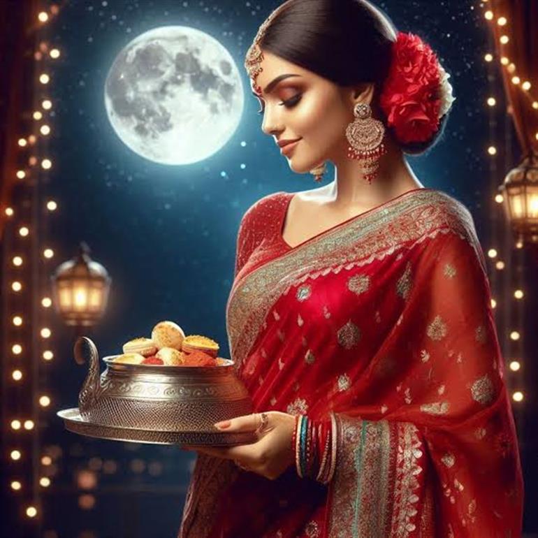 4. Moonrise: Women see the moon through a cloth or sieve and then look at their husbands, symbolizing the passing of blessings.