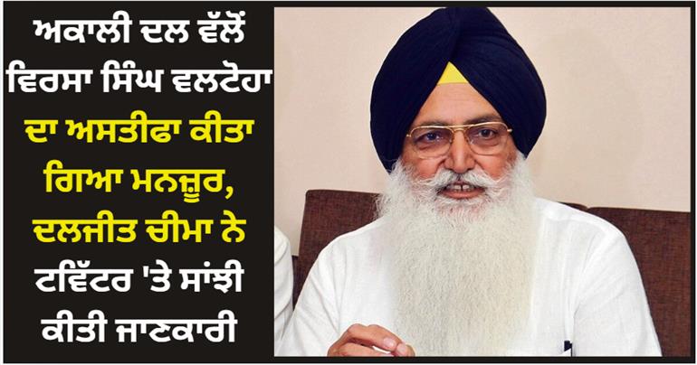 Virsa Singh Valtoha Resignation: ਸਿਆਸੀ ਆਗੂ ਵਿਰਸਾ ਸਿੰਘ ਵਲਟੋਹਾ ਨੂੰ ਲੈਕੇ ਵੱਡੀ ਖਬਰ ਸਾਹਮਣੇ ਆ ਰਹੀ ਹੈ। ਪਿਛਲੇ ਦਿਨੀਂ ਖਬਰ ਆਈ ਸੀ ਕਿ ਅਕਾਲੀ ਦਲ ਨੇ ਵਲਟੋਹਾ ਨੂੰ ਪਾਰਟੀ 'ਚੋਂ ਬਾਹਰ ਕੱਢਣ ਦਾ ਹੁਕਮ ਦਿੱਤਾ ਸੀ, ਜਿਸ ਤੋ ਬਾਅਦ ਸੀਨੀਅਰ ਆਗੂ ਨੇ ਅੱਜ ਆਪਣਾ ਅਸਤੀਫਾ ਪਾਰਟੀ ਨੂੰ ਸੌਂਪਿਆ ਸੀ, ਜਿਸ ਨੂੰ ਅਕਾਲੀ ਦਲ ਵੱਲੋਂ ਮਨਜ਼ੂਰ ਕਰ ਲਿਆ ਗਿਆ ਹੈ। ਇਸ ਬਾਰੇ ਅਕਾਲੀ ਆਗੂ ਦਲਜੀਤ ਸਿੰਘ ਚੀਮਾ ਨੇ ਟਵਿੱਟਰ 'ਤੇ ਪੋਸਟ ਸਾਂਝੀ ਕਰ ਜਾਣਕਾਰੀ ਦਿੱਤੀ।