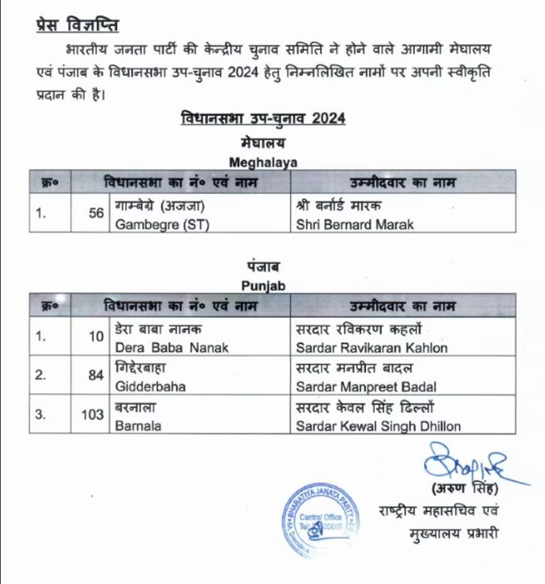 Punjab Bypolls 2024: ਭਾਜਪਾ ਨੇ ਪੰਜਾਬ ਦੀਆਂ ਵਿਧਾਨ ਸਭਾ ਜਿਮਨੀ ਚੋਣਾਂ ਲਈ ਤਿੰਨ ਸੀਟਾਂ 'ਤੇ ਉਮੀਦਵਾਰਾਂ ਦੇ ਨਾਵਾਂ ਦਾ ਐਲਾਨ ਕਰ ਦਿੱਤਾ ਹੈ। ਡੇਰਾ ਬਾਬਾ ਨਾਨਕ ਤੋਂ ਸਰਦਾਰ ਰਵੀਕਰਨ ਕਾਹਲੋਂ, ਗਿੱਦੜਬਾਹਾ ਤੋਂ ਸਰਦਾਰ ਮਨਪ੍ਰੀਤ ਬਾਦਲ ਨੂੰ ਉਮੀਦਵਾਰ ਬਣਾਇਆ ਗਿਆ ਹੈ। ਇਸ ਦੇ ਨਾਲ ਹੀ ਬਰਨਾਲਾ ਤੋਂ ਸਰਦਾਰ ਕੇਵਲ ਸਿੰਘ ਢਿੱਲੋਂ ਨੂੰ ਚੋਣ ਮੈਦਾਨ ਵਿੱਚ ਉਤਾਰਿਆ ਗਿਆ ਹੈ।