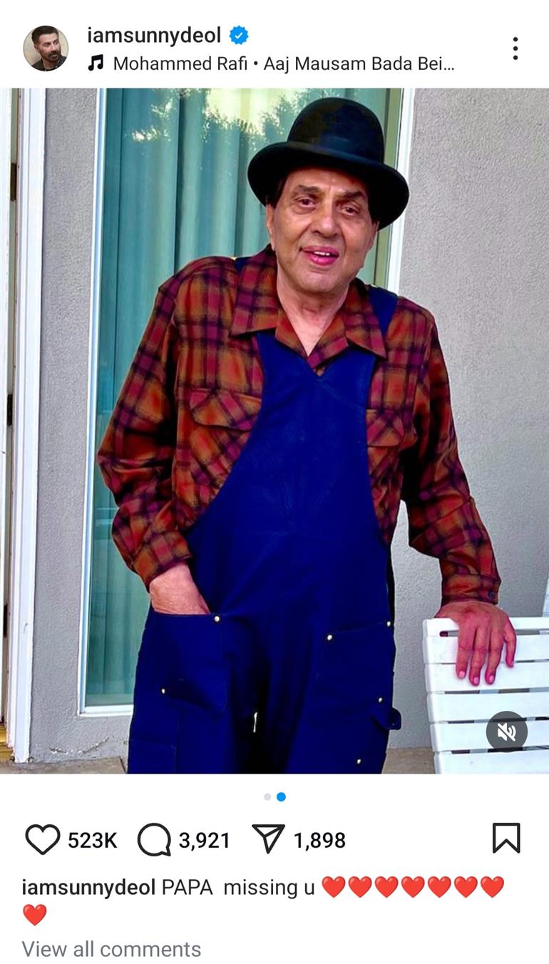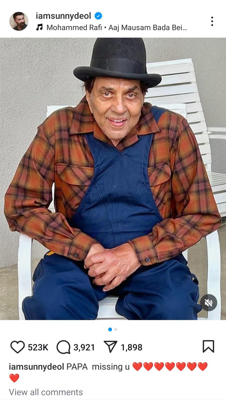 ਹੁਣ ਸਨੀ ਪਾਜੀ ਇੱਕ ਵਾਰ ਫਿਰ ਤੋਂ ਸੁਰਖੀਆਂ ਵਿੱਚ ਆ ਗਏ ਹਨ। ਇਸ ਦਾ ਕਾਰਨ ਓਹਨਾ ਦੀ ਕੋਈ ਫਿਲਮ ਨਹੀਂ, ਸਗੋਂ ਐਕਟਰ ਦੀ ਇੱਕ ਸੋਸ਼ਲ ਮੀਡੀਆ ਪੋਸਟ ਹੈ। ਜੀ ਹਾਂ, ਸਨੀ ਦਿਓਲ ਨੇ ਆਪਣੇ ਪਿਤਾ ਧਰਮਿੰਦਰ ਦੀਆਂ ਤਸਵੀਰਾਂ ਸ਼ੇਅਰ ਕੀਤੀਆਂ ਹਨ, ਪਰ ਇਹਨਾਂ ਤਸਵੀਰਾਂ ਦੀ ਕੈਪਸ਼ਨ ਨੇ ਲੋਕਾਂ ਦਾ ਧਿਆਨ ਆਪਣੇ ਵੱਲ ਖਿੱਚ ਲਿਆ ਹੈ। ਦਰਅਸਲ ਇਹਨਾਂ ਤਸਵੀਰਾਂ ਨੂੰ ਸ਼ੇਅਰ ਕਰਦਿਆਂ ਸਨੀ ਦਿਓਲ ਨੇ ਲਿਖਿਆ, 'ਪਾਪਾ ਆਈ ਮਿਸ ਯੂ'। ਇਹੀ ਨਹੀਂ ਬੌਬੀ ਤੇ ਈਸ਼ਾ ਦਿਓਲ ਨੇ ਵੀ ਇਸ ਪੋਸਟ ਤੇ ਕਮੇਂਟ ਕੀਤੇ ਹਨ। ਹੁਣ ਫੈਨਸ ਆਪਣੇ ਚਹੇਤੇ ਸੁਪਰਸਟਾਰ ਦੀ ਸਿਹਤ ਨੂੰ ਲੈਕੇ ਚਿੰਤਾ ਵਿੱਚ ਪੈ ਗਏ ਹਨ ਕਿ ਆਖਿਰ ਸਨੀ ਦਿਓਲ ਨੇ ਇਹ ਕੇਪਸ਼ਨ ਕਿਉੰ ਲਿਖੀ। ਦੇਖੋ ਇਹ ਤਸਵੀਰਾਂ: