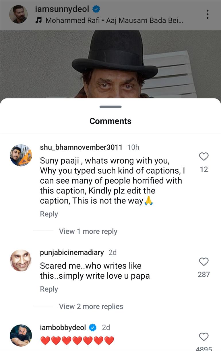 ਦੱਸ ਦਈਏ ਕਿ ਧਰਮਿੰਦਰ ਦੇ ਫੈਨਜ਼ ਇਸ ਪੋਸਟ ਨੂੰ ਲੈਕੇ ਚਿੰਤਾ ਵਿਚ ਹਨ ਅਤੇ ਓਹ ਕਮੈਂਟਸ ਕਰਕੇ ਧਰਮਿੰਦਰ ਦੀ ਖੈਰੀਅਤ ਪੁੱਛ ਰਹੇ ਹਨ। ਇੱਕ ਫੈਨ ਨੇ ਲਿਖਿਆ, "ਸਬ ਠੀਕ ਤਾਂ ਹੈ?" ਇੱਕ ਹੋਰ ਫੈਨ ਮੇ ਕਮੇਂਟ ਕੀਤਾ, ਪਲੀਜ਼ ਐਵੇਂ ਦੀ ਕੇਪਸ਼ਨ ਨਾ ਲਿਖਿਆ ਕਰੋ, ਮੈਂ ਤਾਂ ਡਰ ਹੀ ਗਿਆ ਸੀ।