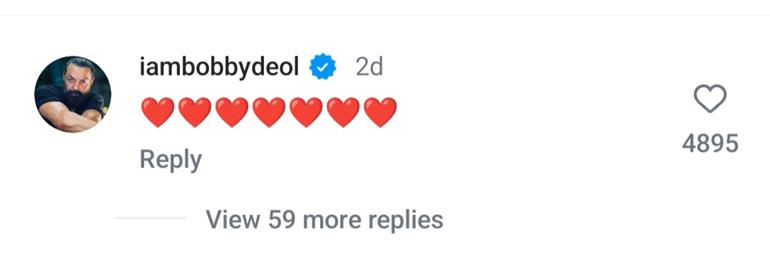 ਇਸਦੇ ਨਾਲ ਨਾਲ ਬੌਬੀ ਤੇ ਈਸ਼ਾ ਦਿਓਲ ਨੇ ਵੀ ਇਸ ਪੋਸਟ ਤੇ ਕਮੇਂਟ ਕੀਤਾ ਹੈ। ਇਹਨਾਂ ਦੋਵਾਂ ਨੇ ਇਸ ਪੋਸਟ ਤੇ ਦਿਲ ਵਾਲੀ ਇਮੋਜੀ ਬਣਾਈ ਹੈ।