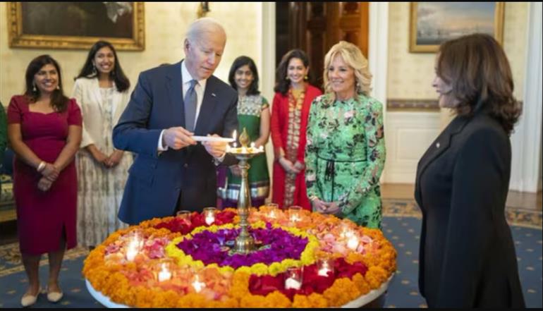2016 ਵਿਚ ਵ੍ਹਾਈਟ ਹਾਊਸ ਵਿਚ ਆਯੋਜਿਤ ਪਹਿਲੇ ਦੀਵਾਲੀ ਦੇ ਜਸ਼ਨ ਨੂੰ ਯਾਦ ਕਰਦੇ ਹੋਏ, ਬਿਡੇਨ ਨੇ ਕਿਹਾ ਕਿ 'ਦੱਖਣੀ ਏਸ਼ੀਆਈ ਅਮਰੀਕੀਆਂ ਸਮੇਤ ਪਰਵਾਸੀਆਂ ਪ੍ਰਤੀ ਨਫ਼ਰਤ ਅਤੇ ਦੁਸ਼ਮਣੀ ਦੇ ਕਾਲੇ ਬੱਦਲ' 2024 ਵਿਚ ਇਕ ਵਾਰ ਫਿਰ ਦਿਖਾਈ ਦੇਣਗੇ। ਅਮਰੀਕਾ ਸਾਨੂੰ ਸਾਡੀ ਸ਼ਕਤੀ ਦੀ ਯਾਦ ਦਿਵਾਉਂਦਾ ਹੈ ਅਤੇ ਸਾਨੂੰ ਸਾਰਿਆਂ ਨੂੰ ਰੋਸ਼ਨੀ ਬਣਨਾ ਚਾਹੀਦਾ ਹੈ। ਪ੍ਰੋਗਰਾਮ ਦੌਰਾਨ ਜੋ ਬਿਡੇਨ ਨੇ ਵ੍ਹਾਈਟ ਹਾਊਸ ਦੇ ਬਲੂ ਰੂਮ ਵਿੱਚ ਰਸਮੀ ਦੀਵਾ ਜਗਾਇਆ। ਇਸ ਮੌਕੇ ਉਨ੍ਹਾਂ ਨੇ ਅਮਰੀਕੀ ਲੋਕਤੰਤਰ ਵਿੱਚ ਯੋਗਦਾਨ ਪਾਉਣ ਲਈ ਦੱਖਣੀ ਏਸ਼ੀਆਈ ਅਮਰੀਕੀ ਭਾਈਚਾਰੇ ਦਾ ਧੰਨਵਾਦ ਕੀਤਾ।