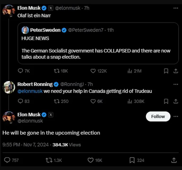 ਵਿਸ਼ੇਸ਼ ਤੌਰ 'ਤੇ, ਮਸਕ ਨੇ ਤਿੰਨ-ਪਾਰਟੀ ਗਠਜੋੜ ਦੇ ਟੁੱਟਣ ਤੋਂ ਬਾਅਦ ਜਰਮਨ ਚਾਂਸਲਰ ਓਲਾਫ ਸਕੋਲਜ਼ ਨੂੰ ਮੂਰਖ ਕਿਹਾ. "ਓਲਾਫ ਇੱਕ ਮੂਰਖ ਹੈ," ਉਸਨੇ ਜਰਮਨ ਵਿੱਚ ਪੋਸਟ ਕੀਤਾ। ਇਸ 'ਤੇ ਇਕ ਯੂਜ਼ਰ ਨੇ ਕਿਹਾ, 'ਏਲਨ, ਸਾਨੂੰ ਟਰੂਡੋ ਤੋਂ ਛੁਟਕਾਰਾ ਪਾਉਣ ਲਈ ਕੈਨੇਡਾ 'ਚ ਤੁਹਾਡੀ ਮਦਦ ਦੀ ਲੋੜ ਹੈ।' ਇਸ ਦਾ ਜਵਾਬ ਦਿੰਦਿਆਂ ਮਸਕ ਨੇ ਕਿਹਾ, 'ਟਰੂਡੋ ਦੀ ਖੇਡ ਆਉਣ ਵਾਲੀਆਂ ਚੋਣਾਂ 'ਚ ਖਤਮ ਹੋ ਜਾਵੇਗੀ।'