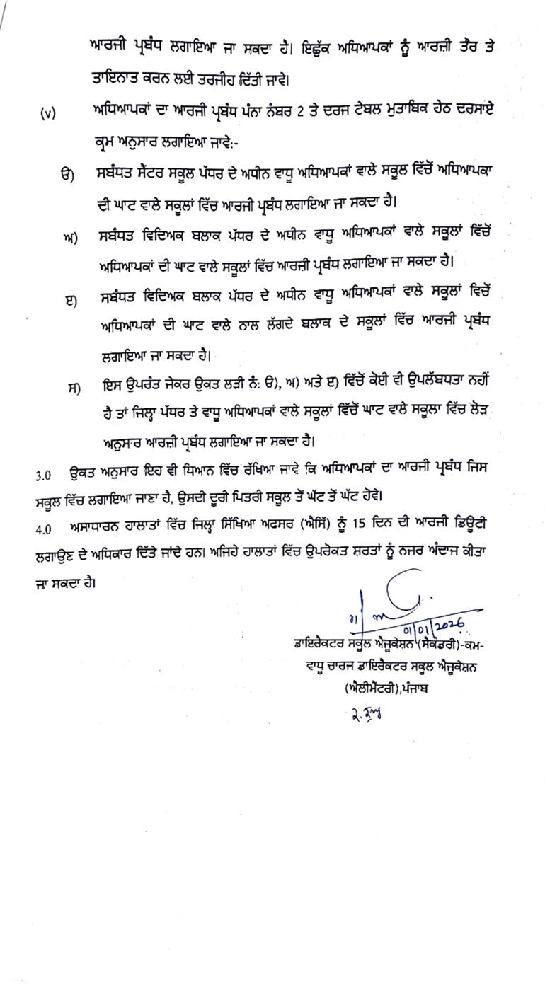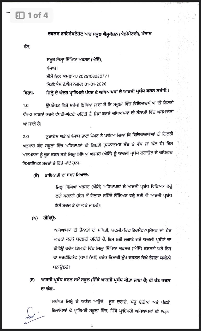 ਪੰਜਾਬ ਸਰਕਾਰ ਦੇ ਸਕੂਲ ਸਿੱਖਿਆ ਵਿਭਾਗ ਵੱਲੋਂ ਪ੍ਰਾਇਮਰੀ ਸਕੂਲਾਂ ਵਿੱਚ ਅਧਿਆਪਕਾਂ ਦੀ ਅਸਥਾਈ ਤਾਇਨਾਤੀ (Temporary Adjustment) ਸਬੰਧੀ ਨਵੇਂ ਵਿਸਥਾਰਤ ਨਿਰਦੇਸ਼ ਜਾਰੀ ਕੀਤੇ ਗਏ ਹਨ। ਇਹ ਹੁਕਮ 1 ਜਨਵਰੀ 2026 ਤੋਂ ਸੂਬੇ ਭਰ ਦੇ ਸਾਰੇ ਸਰਕਾਰੀ ਪ੍ਰਾਇਮਰੀ ਸਕੂਲਾਂ ਵਿੱਚ ਲਾਗੂ ਹੋਣਗੇ