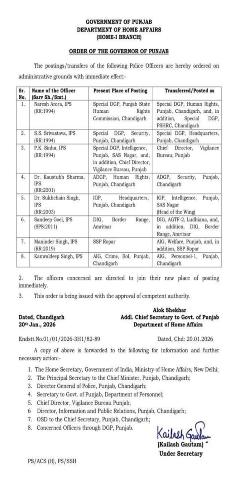ਚੰਡੀਗੜ੍ਹ — ਪੰਜਾਬ ਸਰਕਾਰ ਦੇ ਗ੍ਰਹਿ ਵਿਭਾਗ ਵੱਲੋਂ ਪੰਜਾਬ ਪੁਲਿਸ ਵਿੱਚ ਵੱਡੇ ਪੱਧਰ ’ਤੇ ਪ੍ਰਸ਼ਾਸਕੀ ਤਬਾਦਲਿਆਂ ਦੇ ਹੁਕਮ ਜਾਰੀ ਕੀਤੇ ਗਏ ਹਨ। 20 ਜਨਵਰੀ 2026 ਨੂੰ ਜਾਰੀ ਕੀਤੇ ਸਰਕਾਰੀ ਹੁਕਮ ਅਨੁਸਾਰ, ਕੁੱਲ 8 ਆਈਪੀਐਸ ਅਧਿਕਾਰੀਆਂ ਨੂੰ ਤੁਰੰਤ ਪ੍ਰਭਾਵ ਨਾਲ ਨਵੇਂ ਅਹੁਦਿਆਂ ’ਤੇ ਤਾਇਨਾਤ ਕੀਤਾ ਗਿਆ ਹੈ।