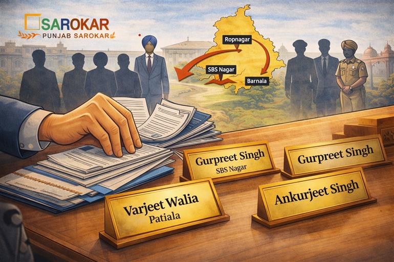 ਪੰਜਾਬ ਸਰਕਾਰ ਨੇ ਰਾਜ ਦੇ ਪ੍ਰਸ਼ਾਸਨਿਕ ਢਾਂਚੇ ਨੂੰ ਹੋਰ ਚੁਸਤ–ਦਰੁਸਤ ਬਣਾਉਣ ਦੇ ਉਦੇਸ਼ ਨਾਲ ਵੱਡਾ ਫੇਰਬਦਲ ਕਰਦਿਆਂ 20 IAS ਅਤੇ 6 PCS ਅਧਿਕਾਰੀਆਂ ਸਮੇਤ ਕੁੱਲ 26 ਅਧਿਕਾਰੀਆਂ ਦੇ ਤਬਾਦਲੇ ਅਤੇ ਨਵੀਆਂ ਨਿਯੁਕਤੀਆਂ ਕੀਤੀਆਂ ਹਨ। ਇਸ ਪ੍ਰਸ਼ਾਸਨਿਕ ਕਦਮ ਹੇਠ ਪਟਿਆਲਾ, ਰੂਪਨਗਰ ਸਮੇਤ ਪੰਜ ਅਹਿਮ ਜ਼ਿਲ੍ਹਿਆਂ ਦੇ ਡਿਪਟੀ ਕਮਿਸ਼ਨਰ ਵੀ ਬਦਲੇ ਗਏ ਹਨ।