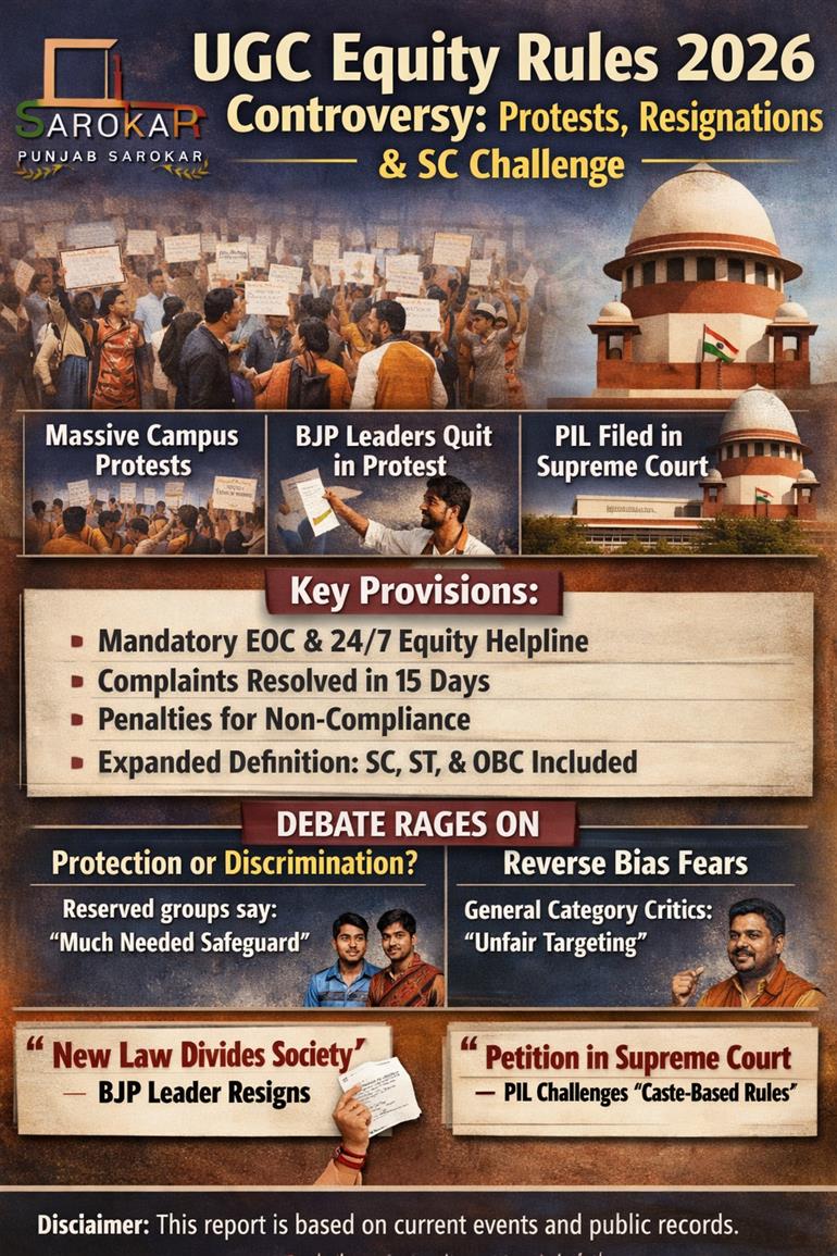 ਨਵੀਂ ਦਿੱਲੀ / ਲਖਨਊ – ਯੂਨੀਵਰਸਿਟੀ ਗ੍ਰਾਂਟਸ ਕਮਿਸ਼ਨ (UGC) ਦੇ ਨਵੇਂ ਨੋਟੀਫਾਈ ਕੀਤੇ "ਉੱਚ ਸਿੱਖਿਆਸੰਸਥਾਵਾਂ ਵਿੱਚ ਇਕੁਇਟੀ ਦੀ ਪ੍ਰੋਮੋਸ਼ਨ ਨਿਯਮ, 2026" ਨੇ ਪੂਰੇ ਭਾਰਤ ਵਿੱਚ ਇੱਕ ਨਵਾਂ ਵਿਵਾਦ ਛੇੜ ਦਿੱਤਾ ਹੈ।ਇਸ ਕਾਰਨ ਸੱਤਾਧਾਰੀ ਭਾਜਪਾ ਦੇ ਅੰਦਰ ਵੱਡੇ ਪੱਧਰ 'ਤੇ ਅਸਤੀਫੇ, ਵਿਦਿਆਰਥੀਆਂ ਦੇ ਭਾਰੀ ਪ੍ਰਦਰਸ਼ਨ ਅਤੇਸੁਪਰੀਮ ਕੋਰਟ ਵਿੱਚ ਇੱਕ ਵੱਡੀ ਕਾਨੂੰਨੀ ਚੁਣੌਤੀ ਦੇਖਣ ਨੂੰ ਮਿਲ ਰਹੀ ਹੈ।