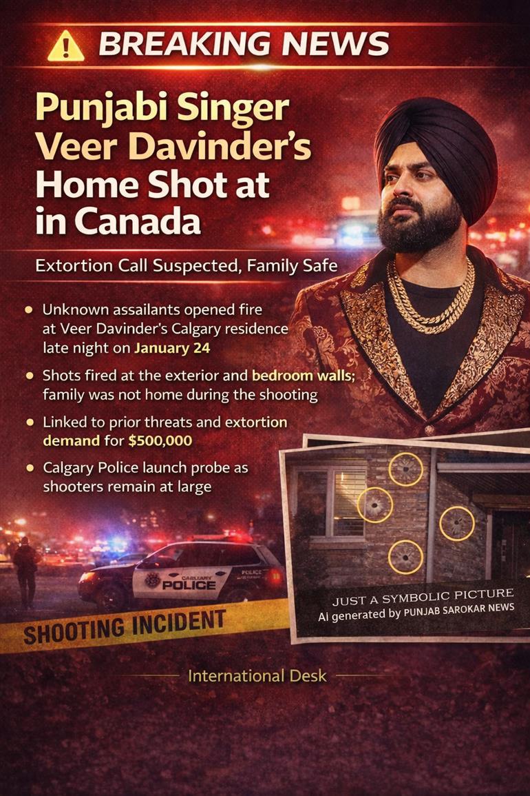 ਕੈਨੇਡਾ ਦੇ ਕੈਲਗਰੀ ਸ਼ਹਿਰ ਵਿੱਚ ਪੰਜਾਬੀ ਸੰਗੀਤ ਜਗਤ ਨਾਲ ਜੁੜੇ ਗਾਇਕ ਵੀਰ ਦਵਿੰਦਰ ਦੇ ਘਰ ‘ਤੇ ਅਣਜਾਣ ਹਮਲਾਵਰਾਂ ਵੱਲੋਂ ਫਾਇਰਿੰਗ ਕੀਤੇ ਜਾਣ ਦੀ ਘਟਨਾ ਸਾਹਮਣੇ ਆਈ ਹੈ। ਇਹ ਘਟਨਾ 24 ਜਨਵਰੀ ਦੀ ਰਾਤ ਕਰੀਬ 10:30 ਵਜੇ ਵਾਪਰੀ, ਜਿਸ ਨਾਲ ਇਲਾਕੇ ਵਿੱਚ ਦਹਿਸ਼ਤ ਫੈਲ ਗਈ। ਖੁਸ਼ਕਿਸਮਤੀ ਨਾਲ, ਇਸ ਸਮੇਂ ਘਰ ਅੰਦਰ ਕੋਈ ਮੌਜੂਦ ਨਹੀਂ ਸੀ ਅਤੇ ਪਰਿਵਾਰ ਪੂਰੀ ਤਰ੍ਹਾਂ ਸੁਰੱਖਿਅਤ ਹੈ।