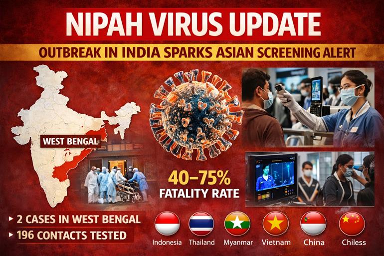 ਨਵੀਂ ਦਿੱਲੀ : ਪੱਛਮੀ ਬੰਗਾਲ ਵਿੱਚ ਨਿਪਾਹ ਵਾਇਰਸ ਦੇ ਦੋ ਮਾਮਲਿਆਂ ਦੀ ਪੁਸ਼ਟੀ ਤੋਂ ਬਾਅਦ ਭਾਰਤੀ ਅਧਿਕਾਰੀਆਂ ਨੇ ਕਿਹਾ ਹੈ ਕਿ ਸਥਿਤੀ ਪੂਰੀ ਤਰ੍ਹਾਂ ਕਾਬੂ ਵਿੱਚ ਹੈ। ਇਸ ਦੇ ਬਾਵਜੂਦ, ਕਈ ਏਸ਼ੀਆਈ ਦੇਸ਼ਾਂ ਨੇ ਸਾਵਧਾਨੀ ਦੇ ਤੌਰ ’ਤੇ ਭਾਰਤ ਤੋਂ ਆਉਣ ਵਾਲੇ ਯਾਤਰੀਆਂ ਲਈ ਹਵਾਈ ਅੱਡਿਆਂ ’ਤੇ ਸਿਹਤ ਜਾਂਚ ਅਤੇ ਨਿਗਰਾਨੀ ਸਖ਼ਤ ਕਰ ਦਿੱਤੀ ਹੈ।