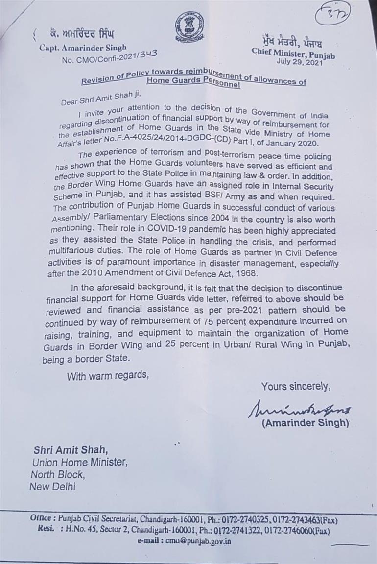 Interestingly Capt Amrinder Singh wrote a DO Letter to Amit Shah asking for the revision of policy for the allowances to Home Guards Volunteers Dated 29/7/2021, which clearly shows that Capt Amrinder Singh does not know that what his officers are doing in the Government.