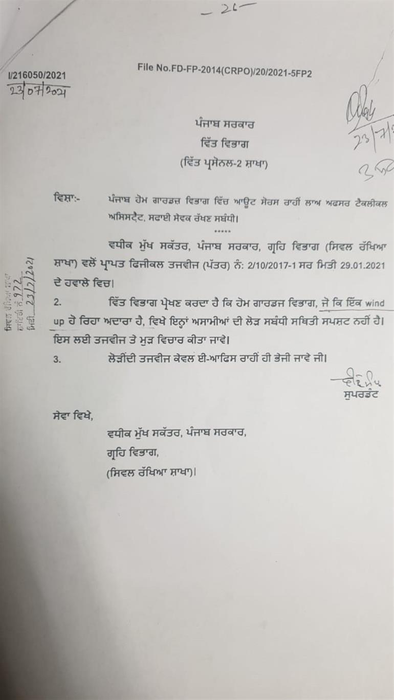For the last 1 Year there has been internal movement of some officers (Suresh Kumar CPS, Anurag Aggarwal IAS, V K Bhawara IPS) to close down the department just to satisfy their own egos. As one of the Officers became Head of the Department (Commandant General) from the Punjab Home Guards Cadre. which was not liked by (Suresh Kumar CPS, Anurag Aggarwal IAS, V K Bhawara IPS). Even as Punjab and Haryana High Court upheld the decision that Punjab Home Guards Cadre can Head the Department, Suresh Kumar CPS and Anurag Aggarwal IAS appointed V K Bhawara as Head of the Department. So there are now 2 Head of the Departments and there is complete chaos in the Department. When things started getting out of control, these officers clouded among themselves and started the process of unwinding the department, without informing the Punjab Cabinet. Recently a letter came into the Public Domain Dated 23/7/2021 from the Finance Department asking for some clarifications.