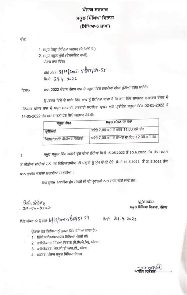 ਜਾਣਕਾਰੀ ਅਨੁਸਾਰ ਮਿਤੀ 2 ਮਈ 2022 ਤੋਂ 14 ਮਈ 2022 ਤਕ ਸਕੂਲਾਂ ਦੀ ਸਮਾਂ ਸਾਰਣੀ 'ਚ ਬਦਲਾਅ ਕੀਤਾ ਗਿਆ ਹੈ। ਪੰਜਾਬ ਸਕੂਲ ਸਿੱਖਿਆ ਵਿਭਾਗ ਵੱਲੋਂ ਜਾਰੀ ਕੀਤੇ ਹੁਕਮਾਂ ਅਨੁਸਾਰ ਹੁਣ ਪ੍ਰਾਈਮਰੀ ਸਕੂਲ ਸਵੇਰੇ 7 ਵਜੇ ਤੋਂ 11 ਵਜੇ ਤੱਕ ਲੱਗਣਗੇ। ਮਿਡਲ-ਹਾਈ ਸੀਨੀਅਰ ਸੰਕੈਡਰੀ ਸਕੂਲ ਸਵੇਰੇ 7 ਵਜੇ ਤੋਂ 12.30 ਵਜੇ ਤਕ ਲੱਗਣਗੇ।