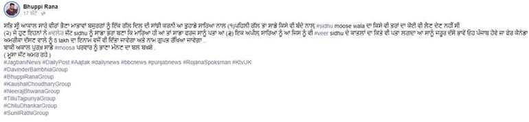 Sidhu Moosewala Death : ਪੰਜਾਬੀ ਦੇ ਪ੍ਰਸਿੱਧ ਗਾਇਕ ਸਿੱਧੂ ਮੂਸੇਵਾਲਾ ਦੇ ਕਤਲ ਤੋਂ ਬਾਅਦ ਪੰਜਾਬ ਹੀ ਨਹੀਂ ਸਗੋਂ ਗੁਆਂਢੀ ਸੂਬਿਆਂ ਦੇ ਗੈਂਗਸਟਰ ਵੀ ਸਰਗਰਮ ਹੋ ਗਏ ਹਨ। ਉੱਤਰ ਪ੍ਰਦੇਸ਼ ਦੇ ਗੈਂਗਸਟਰ ਗਰੁੱਪ ਭੂਪੀ ਰਾਣਾ ਵੱਲੋਂ ਸਿੱਧੂ ਮੂਸੇਵਾਲਾ ਦੇ ਕਤਲ ਦਾ ਬਦਲਾ ਲੈਣ ਦੀ ਸੋਸ਼ਲ ਮੀਡੀਆ ਤੇ ਪਾਈ ਪੋਸਟ ਤੋਂ ਬਾਅਦ ਹੁਣ ਉਨ੍ਹਾਂ ਕਾਤਲਾਂ ਦਾ ਪਤਾ ਦੱਸਣ ਵਾਲੇ ਨੂੰ ਪੰਜ ਲੱਖ ਰੁਪਏ ਇਨਾਮ ਦੇਣ ਦਾ ਐਲਾਨ ਕੀਤਾ ਹੈ। ਭੂਪੀ ਰਾਣਾ ਨੇ ਆਪਣੇ ਫੇਸਬੁੱਕ ਪੇਜ ਤੇ ਸਾਂਝੀ ਕੀਤੀ ਪੋਸਟ ਵਿੱਚ ਲਿਖਿਆ ਹੈ ਕਿ ਸਤਿ ਸ੍ਰੀ ਅਕਾਲ ਸਾਰੇ ਵੀਰਾਂ, ਭੈਣਾਂ, ਮਾਤਾਵਾਂ, ਬਜ਼ੁਰਗਾਂ ਨੂੰ ਇਕ ਗੱਲ ਦਿਲ ਦੀ ਸਾਂਝੀ ਕਰਨੀ ਹੈ ਤੁਹਾਡੇ ਸਾਰਿਆਂ ਨਾਲ , ਪਹਿਲੀ ਗੱਲ ਤਾਂ ਸਾਡੇ ਕਿਸੇ ਵੀ ਬੰਦੇ ਨਾਲ ਸਿੱਧੂ ਮੂਸੇਵਾਲਾ ਦਾ ਕਿਸੇ ਤਰ੍ਹਾਂ ਦਾ ਕੋਈ ਵੀ ਲੈਣਾ ਦੇਣਾ ਨਹੀਂ, ਜੇ ਹੁਣ ਇਨ੍ਹਾਂ ਨੇ ਦਲੇਰ ਜੱਤ ਸਿੱਧੂ ਨੂੰ ਸਾਡਾ ਭਰਾ ਬਣਾ ਕੇ ਮਾਰਿਆ ਹੈ ਤਾਂ ਸਾਡਾ ਫ਼ਰਜ਼ ਸਾਨੂੰ ਪਤਾ ਹੈ। ਇਕ ਅਪੀਲ ਹੈ ਸਾਰਿਆਂ ਨੂੰ ਜਿਸ ਨੂੰ ਵੀ ਵੀਰ ਸਿੱਧੂ ਦੇ ਕਾਤਲਾਂ ਦਾ ਕਿਤੇ ਵੀ ਪਤਾ ਲੱਗਦਾ ਹੈ ਸਾਨੂੰ ਜ਼ਰੂਰ ਦੱਸੋ ਭਾਵੇਂ ਉਹ ਪੰਜਾਬ ਹੋਵੇ ਜਾਂ ਫਿਰ ਕੈਨੇਡਾ, ਅਮਰੀਕਾ, ਦੱਸਣ ਵਾਲੇ ਨੂੰ ਪੰਜ ਲੱਖ ਰੁਪਏ ਇਨਾਮ ਵਜੋਂ ਦਿੱਤੇ ਜਾਣਗੇ ਅਤੇ ਨਾਮ ਗੁਪਤ ਰੱਖਿਆ ਜਾਵੇਗਾ। ਸਮਝਿਆ ਜਾਂਦਾ ਹੈ ਕਿ ਭੂਪੀ ਰਾਣਾ ਗੈਂਗਸਟਰ ਗਰੁੱਪ ਨੇ ਕੈਨੇਡਾ ਵਿੱਚ ਬੈਠੇ ਗੋਲਡੀ ਬਰਾੜ ਦੇ ਪਤੇ ਦੀ ਗੱਲ ਕੀਤੀ ਹੈ। ਅਖੀਰ ਵਿੱਚ ਭੂਪੀ ਰਾਣਾ ਨੇ ਲਿਖਿਆ ਹੈ ਬਾਕੀ ਅਕਾਲ ਪੁਰਖ ਸਾਡੇ ਮੂਸਾ ਪਰਿਵਾਰ ਨੂੰ ਭਾਣਾ ਮੰਨਣ ਦਾ ਬਲ ਬਖ਼ਸ਼ੇ ਮੂਸਾ ਜੱਟ ਅਮਰ ਰਹੇ।