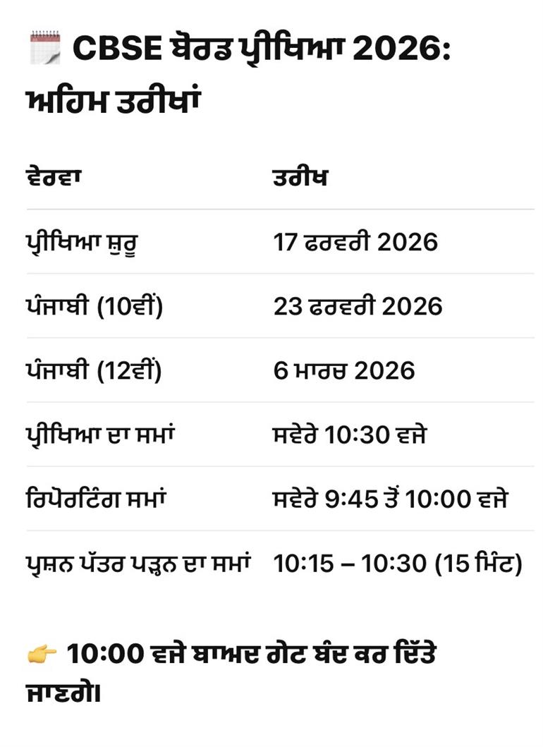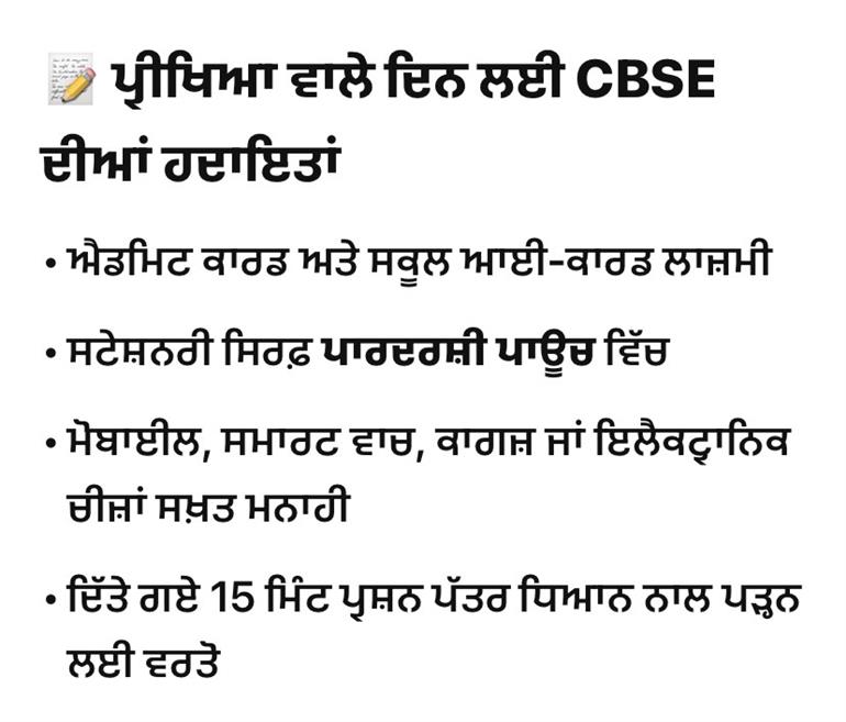 ਕੇਂਦਰੀ ਸੈਕੰਡਰੀ ਸਿੱਖਿਆ ਬੋਰਡ (CBSE) ਨੇ 10ਵੀਂ ਅਤੇ 12ਵੀਂ ਜਮਾਤ ਦੀਆਂ ਸਾਲਾਨਾ ਪ੍ਰੀਖਿਆਵਾਂ 2026 ਲਈ ਐਡਮਿਟ ਕਾਰਡ (ਰੋਲ ਨੰਬਰ) ਅਧਿਕਾਰਤ ਤੌਰ 'ਤੇ ਜਾਰੀ ਕਰ ਦਿੱਤੇ ਹਨ। ਪ੍ਰੀਖਿਆਵਾਂ 17 ਫਰਵਰੀ 2026 ਤੋਂ ਸ਼ੁਰੂ ਹੋ ਰਹੀਆਂ ਹਨ। ਪੰਜਾਬ ਦੇ ਸਮੂਹ ਵਿਦਿਆਰਥੀਆਂ, ਮਾਪਿਆਂ ਅਤੇ ਅਧਿਆਪਕਾਂ ਲਈ ਹੇਠ ਲਿਖੀਜਾਣਕਾਰੀ ਅਤਿ ਲੋੜੀਂਦੀ ਹੈ: