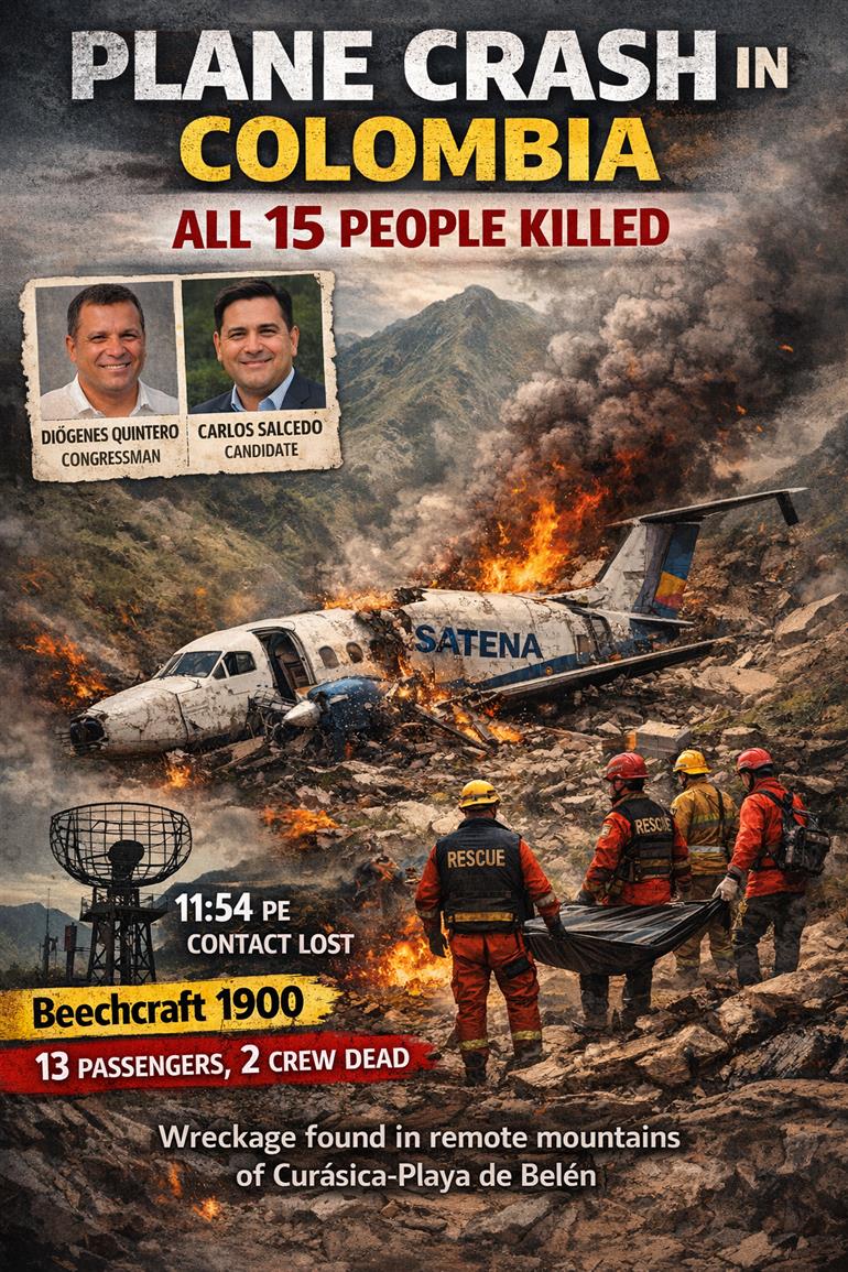 ਕੋਲੰਬੀਆ ਦੇ ਉੱਤਰ-ਪੂਰਬੀ ਸੂਬੇ ਨੋਰਟ ਡੇ ਸੈਂਟੇਂਡਰ ਵਿੱਚ ਬੁੱਧਵਾਰ ਨੂੰ ਇੱਕ ਵੱਡਾ ਹਵਾਈ ਹਾਦਸਾ ਵਾਪਰਿਆ, ਜਦੋਂ ਸਤੇਨਾ ਏਅਰਲਾਈਨਜ਼ ਦਾ ਇੱਕ ਛੋਟਾ ਜਹਾਜ਼ ਬੀਚਕ੍ਰਾਫਟ 1900D ਹਾਦਸਾਗ੍ਰਸਤ ਹੋ ਗਿਆ। ਇਸ ਹਾਦਸੇ ਵਿੱਚ ਜਹਾਜ਼ ‘ਚ ਸਵਾਰ ਸਾਰੇ 15 ਲੋਕਾਂ ਦੀ ਮੌਤ ਹੋ ਗਈ। ਮ੍ਰਿਤਕਾਂ ਵਿੱਚ ਕੋਲੰਬੀਆ ਦੇ ਸੰਸਦ ਮੈਂਬਰ ਡਾਇਓਜੇਨਸ ਕੁਇੰਟੇਰੋ ਅਤੇ ਕਾਂਗਰਸ ਦੇ ਉਮੀਦਵਾਰ ਕਾਰਲੋਸ ਸਾਲਸੇਡੋ ਵੀ ਸ਼ਾਮਲ ਹਨ।