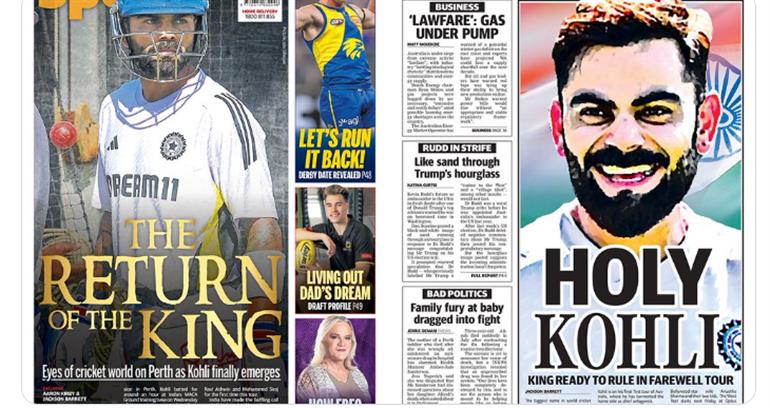 ਵੈਸਟ ਆਸਟ੍ਰੇਲੀਆ ਨੇ ਪਹਿਲੇ ਪੰਨੇ 'ਤੇ ਵੱਡੇ ਸ਼ਬਦਾਂ 'ਚ ਲਿਖਿਆ ਸੀ-'ਦ ਰਿਟਰਨ ਆਫ ਦਿ ਕਿੰਗ'। ਪੂਰੀ ਦੁਨੀਆ ਦੀਆਂ ਨਜ਼ਰਾਂ ਪਰਥ ਅਤੇ ਕੋਹਲੀ 'ਤੇ ਹਨ। ਇਸ ਤੋਂ ਬਾਅਦ ਇਕ ਹੋਰ ਪੰਨੇ 'ਤੇ ਵੈਸਟ ਆਸਟ੍ਰੇਲੀਆ ਨੇ 'ਹੋਲੀ ਕੋਹਲੀ (ਪਵਿੱਤਰ ਕੋਹਲੀ) ਲਿਖਿਆ। ਕਿੰਗ ਆਪਣੀ ਵਿਦਾਇਗੀ ਲੜੀ ਵਿੱਚ ਦੁਨੀਆ ਨੂੰ ਆਪਣੇ ਹੱਥਾਂ ਵਿੱਚ ਲੈਣ ਲਈ ਤਿਆਰ ਹੈ। ਆਸਟ੍ਰੇਲੀਅਨ ਮੀਡੀਆ ਦੇ ਸਕਰੀਨਸ਼ਾਟ ਸੋਸ਼ਲ ਮੀਡੀਆ 'ਤੇ ਵਾਇਰਲ ਹੋ ਰਹੇ ਹਨ। ਇਸ ਤੋਂ ਪਹਿਲਾਂ 'ਦ ਟੈਲੀਗ੍ਰਾਫ਼' ਨੇ ਇਸ ਲੜੀ ਨੂੰ 'ਯੁਗਾਂ ਦੀ ਲੜਾਈ' ਦੱਸਿਆ ਸੀ।