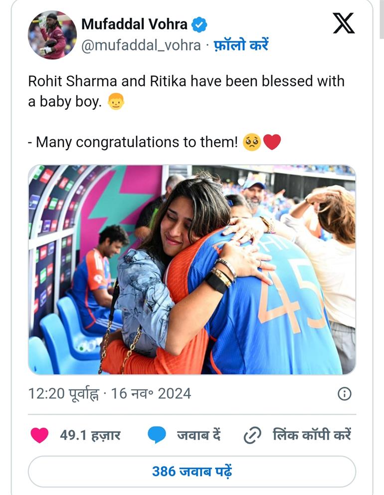 ਠੀਕ 3 ਸਾਲ ਬਾਅਦ ਘਰ ਧੀ ਨੇ ਜਨਮ ਲਿਆ। ਵਿਆਹ ਦੇ 9 ਸਾਲ ਬਾਅਦ ਘਰ 'ਚ ਪੁੱਤਰ ਨੇ ਜਨਮ ਲਿਆ ਹੈ। ਰੋਹਿਤ ਅਤੇ ਰਿਤਿਕਾ ਨੇ ਆਪਣੇ ਬੇਟੇ ਦਾ ਕੀ ਨਾਮ ਰੱਖਿਆ ਹੈ? ਇਸ ਗੱਲ ਦਾ ਅਜੇ ਤੱਕ ਖੁਲਾਸਾ ਨਹੀਂ ਹੋਇਆ ਹੈ। ਪਰ ਜਿਵੇਂ ਹੀ ਰੋਹਿਤ ਦੇ ਪਿਤਾ ਬਣਨ ਦੀ ਖਬਰ ਮਿਲੀ ਤਾਂ ਉਨ੍ਹਾਂ ਦੇ ਪ੍ਰਸ਼ੰਸਕਾਂ 'ਚ ਇਕ ਵੱਖਰਾ ਹੀ ਉਤਸ਼ਾਹ ਦੇਖਣ ਨੂੰ ਮਿਲਿਆ।