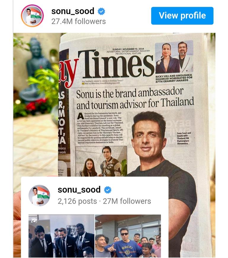 ਸੋਨੂੰ ਨੇ ਕੋਰੋਨਾ ਦੌਰਾਨ ਲੱਖਾਂ ਬੇਘਰ ਲੋਕਾਂ ਦੀ ਮਦਦ ਕੀਤੀ। ਆਪਣੇ ਪਰਉਪਕਾਰੀ ਕੰਮਾਂ ਕਾਰਨ ਉਸ ਨੇ ਦੁਨੀਆ ਭਰ ਵਿੱਚ ਇੱਕ ਵੱਖਰੀ ਪਛਾਣ ਹਾਸਲ ਕੀਤੀ। ਇਸੇ ਲਈ ਥਾਈਲੈਂਡ ਦੇ ਸੈਰ-ਸਪਾਟਾ ਮੰਤਰਾਲੇ ਨੇ ਉਨ੍ਹਾਂ ਨੂੰ ਆਨਰੇਰੀ ਸੈਰ-ਸਪਾਟਾ ਸਲਾਹਕਾਰ ਨਿਯੁਕਤ ਕੀਤਾ ਅਤੇ ਇਸ ਲਈ ਉਨ੍ਹਾਂ ਨੂੰ ਵਿਸ਼ੇਸ਼ ਸਰਟੀਫਿਕੇਟ ਵੀ ਦਿੱਤਾ ਗਿਆ।ਇੰਸਟਾਗ੍ਰਾਮ 'ਤੇ ਇਹ ਜਾਣਕਾਰੀ ਦਿੰਦੇ ਹੋਏ ਉਸ ਨੇ ਖੁਦ ਲਿਖਿਆ, 'ਮੈਂ ਥਾਈਲੈਂਡ ਵਿੱਚ ਸੈਰ-ਸਪਾਟੇ ਲਈ ਬ੍ਰਾਂਡ ਅੰਬੈਸਡਰ ਅਤੇ ਸਲਾਹਕਾਰ ਵਜੋਂ ਚੁਣੇ ਜਾਣ 'ਤੇ ਸਨਮਾਨਿਤ ਅਤੇ ਨਿਮਰਤਾ ਮਹਿਸੂਸ ਕਰ ਰਿਹਾ ਹਾਂ। ਮੇਰੀ ਪਹਿਲੀ ਅੰਤਰਰਾਸ਼ਟਰੀ ਯਾਤਰਾ ਆਪਣੇ ਪਰਿਵਾਰ ਨਾਲ ਇਸ ਖੂਬਸੂਰਤ ਦੇਸ਼ ਦੀ ਸੀ ਅਤੇ ਆਪਣੀ ਨਵੀਂ ਭੂਮਿਕਾ ਵਿੱਚ ਮੈਂ ਦੇਸ਼ ਦੀ ਸੁੰਦਰਤਾ ਅਤੇ ਸੱਭਿਆਚਾਰਕ ਵਿਰਾਸਤ ਨੂੰ ਸਲਾਹ ਦੇਣ ਉਤਸ਼ਾਹਿਤ ਹਾਂ। ਤੁਹਾਡੇ ਸਾਰਿਆਂ ਦੇ ਪਿਆਰ ਅਤੇ ਸ਼ੁੱਭ ਕਾਮਨਾਵਾਂ ਲਈ ਧੰਨਵਾਦ
