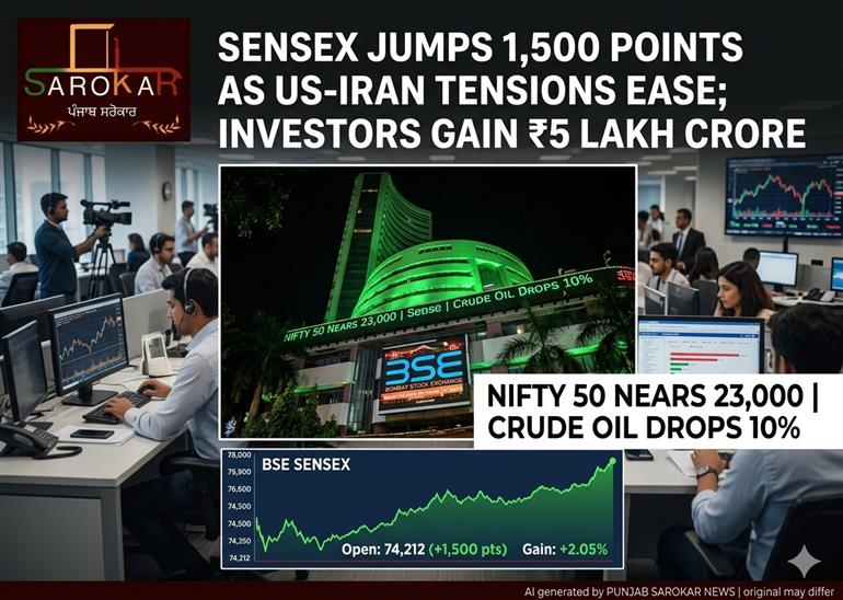 ਭਾਰਤੀ ਸ਼ੇਅਰ ਬਾਜ਼ਾਰ ਵਿੱਚ ਮੰਗਲਵਾਰ ਨੂੰ ਜ਼ਬਰਦਸਤ ਤੇਜ਼ੀ ਦਰਜ ਕੀਤੀ ਗਈ। ਬੀ.ਐਸ.ਈ. ਸੈਂਸੈਕਸ 1,500 ਤੋਂ ਵੱਧ ਅੰਕ ਚੜ੍ਹ ਕੇ 74,212 ’ਤੇ ਖੁੱਲ੍ਹਿਆ, ਜਦਕਿ ਨਿਫਟੀ 50 ਲਗਭਗ 400 ਅੰਕ ਵਧ ਕੇ 22,900 ਦੇ ਪੱਧਰ ’ਤੇ ਪਹੁੰਚ ਗਿਆ। ਇਸ ਉਛਾਲ ਨਾਲ ਨਿਵੇਸ਼ਕਾਂ ਦੀ ਸੰਪਤੀ ਵਿੱਚ ਮਿੰਟਾਂ ਵਿੱਚ ਹੀ ਲਗਭਗ ₹5 ਲੱਖ ਕਰੋੜ ਦਾ ਵਾਧਾ ਹੋਇਆ।