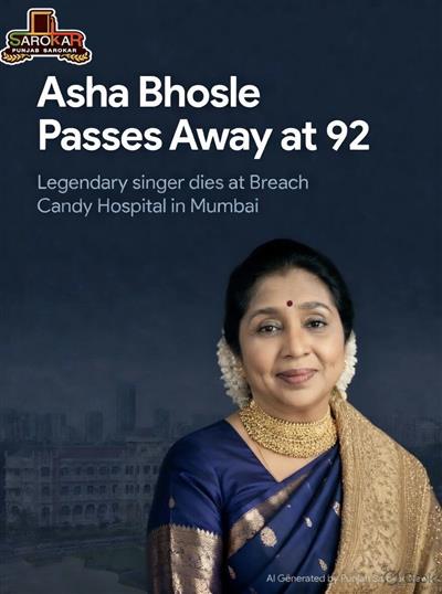 ਸੰਗੀਤ ਦੀ ਦੁਨੀਆਂ ਉੱਤੇ ਵੱਡਾ ਸਦਮਾ : ਆਸ਼ਾ ਭੋਸਲੇ ਨੇ ਲਏ ਆਖਰੀ ਸਾਹ, 92 ਸਾਲ ਦੀ ਉਮਰ ਵਿਚ ਮੁੰਬਈ ਦੇ ਬ੍ਰੀਚ ਕੈਂਡੀ ਹਸਪਤਾਲ ਵਿਚ ਹੋਇਆ ਦੇਹਾਂਤ