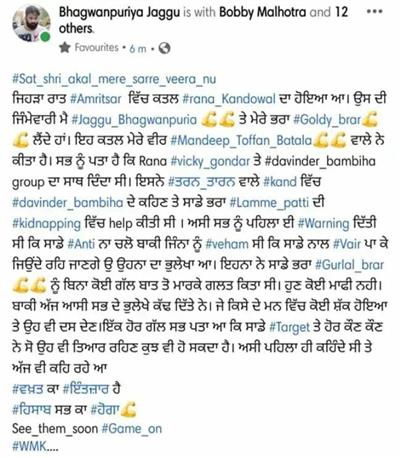 ਗੈਂਗਸਟਰ ਦਵਿੰਦਰ ਬੰਬੀਹਾ ਗਰੁੱਪ ਵਲੋਂ ਫੇਸਬੁੱਕ ’ਤੇ ਗੈਂਗਸਟਰ ਲਾਰੈਂਸ ਬਿਸ਼ਨੋਈ, ਗੋਲਡੀ ਬਰਾੜ, ਜੱਗੂ ਭਗਵਾਨਪੁਰੀਆ ਅਤੇ ਮਨਕੀਰਤ ਔਲਖ ਤੋਂ ਬਦਲਾ ਲੈਣ ਦੀਆਂ ਲਗਾਤਾਰ ਧਮਕੀਆਂ ਦਿੱਤੀਆਂ ਜਾ ਰਹੀਆਂ ਹਨ।